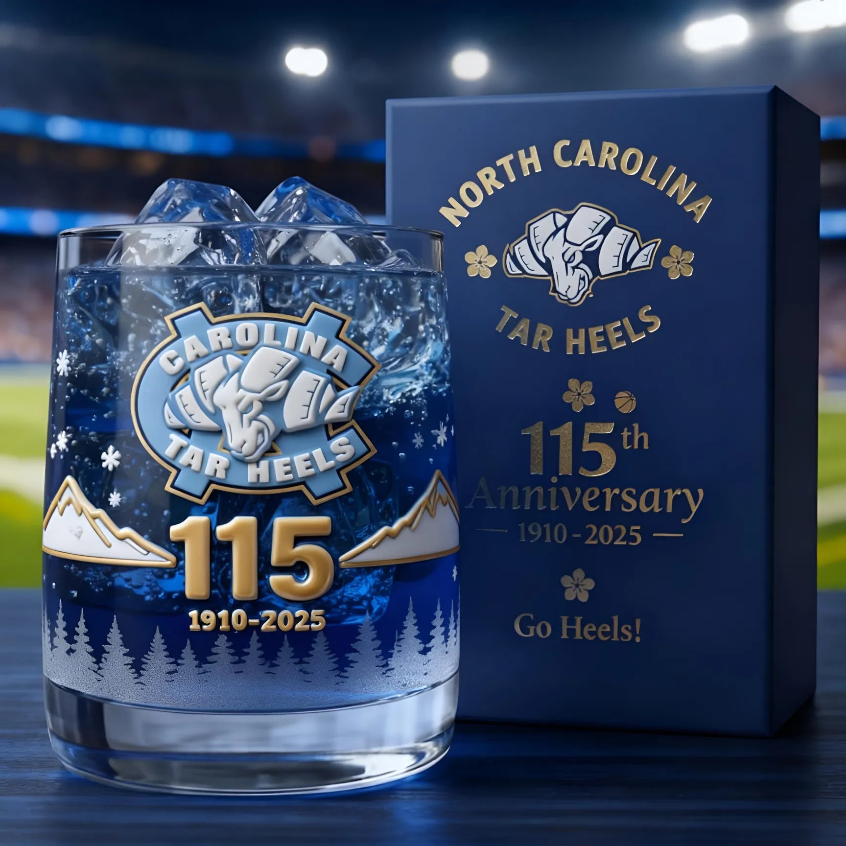 Elevate Your Spirit, Honor the Legacy.Crafted for true Tar Heels and whiskey connoisseurs, this exclusive glass celebrates 115 years of Carolina pride. Featuring an elegantly etched "Tar Heels" logo and the milestone years "1910-2025," it's more than a glass-it's a piece of history.